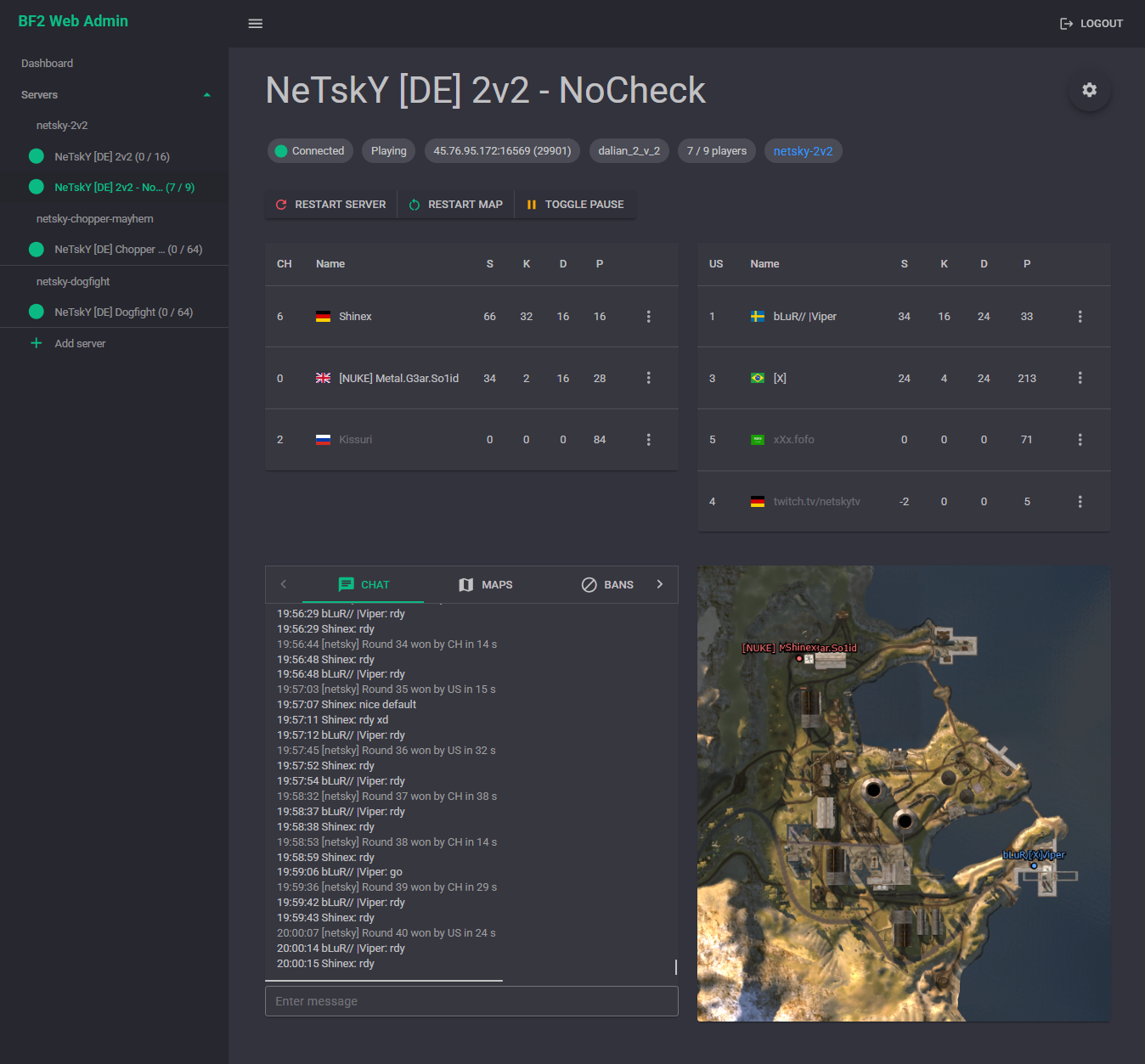 - Restart server, restart map, toggle pause